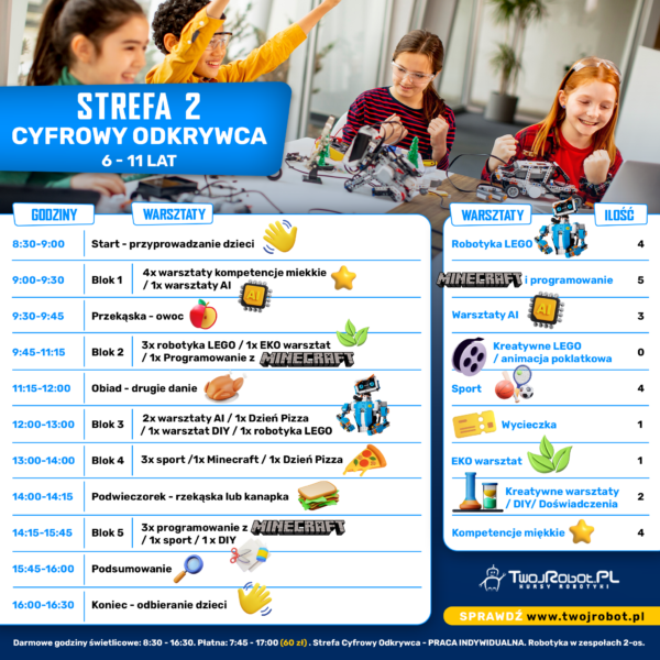 Program zgodny ze strefą: LEGO, Minecraft, AI, eksperymenty, sport, DIY.