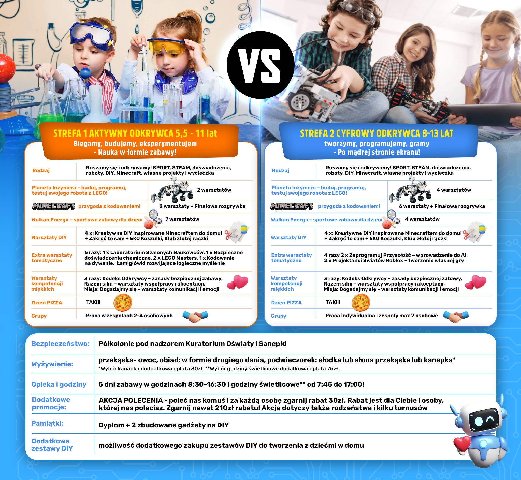 1 półkolonia = 2 strefy do wyboru! Półkolonie dla dzieci Aktywny Odkrywca i Cyfrowy Odkrywca. Super spędzony czas w mieście dla dzieci: roboty Lego, Minecraft, AI, eksperymenty, wycieczka, DIY i inne atrakcje! Cena rośnie co tydzień, więc nie zwlekaj i zapisz swoje dziecko na niezapomniane półkolonie już dziś!