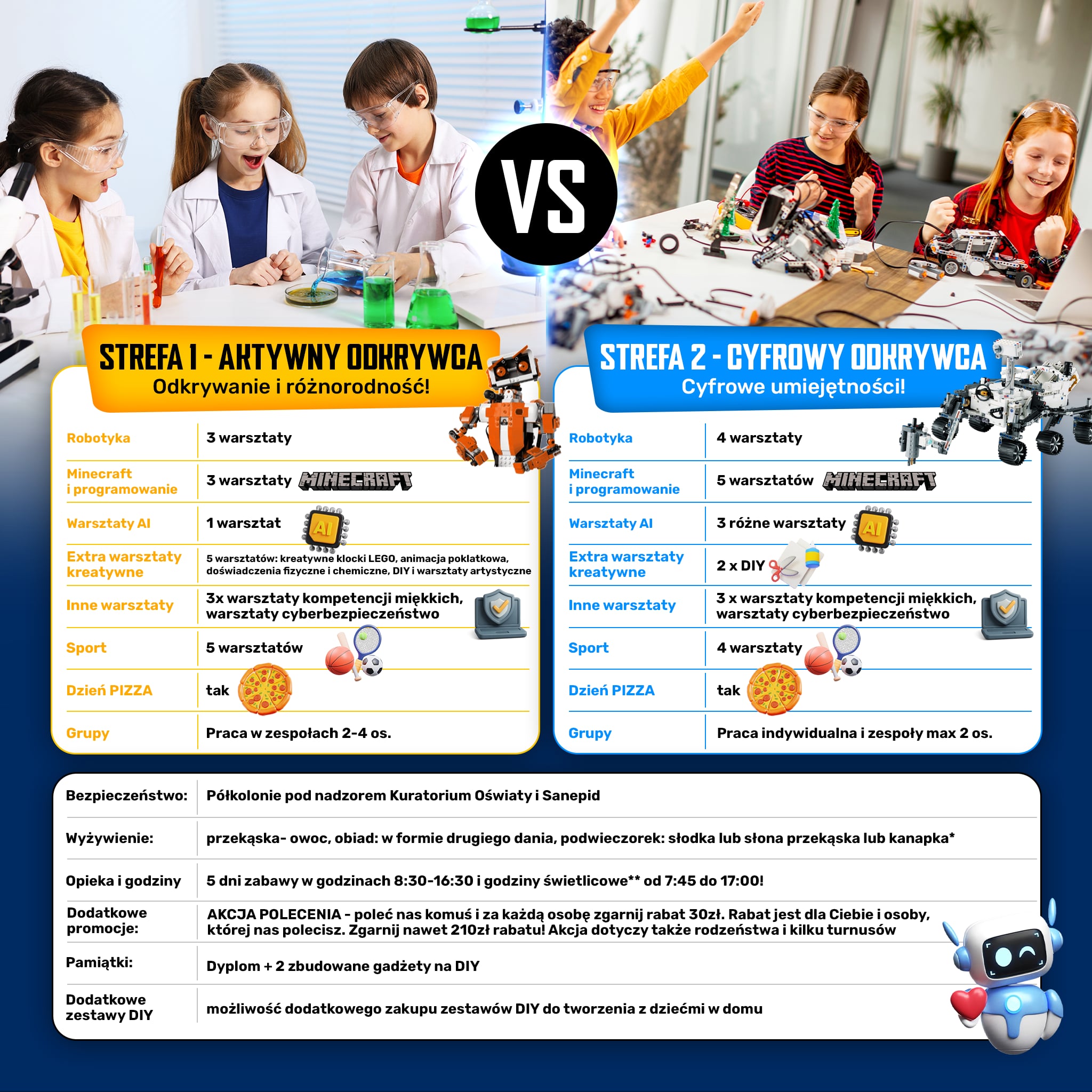 1 półkolonia = 2 strefy do wyboru! Półkolonie dla dzieci Aktywny Odkrywca i Cyfrowy Odkrywca. Super spędzony czas w mieście dla dzieci: roboty Lego, Minecraft, AI, eksperymenty, wycieczka, DIY i inne atrakcje! Cena rośnie co tydzień, więc nie zwlekaj i zapisz swoje dziecko na niezapomniane półkolonie już dziś!